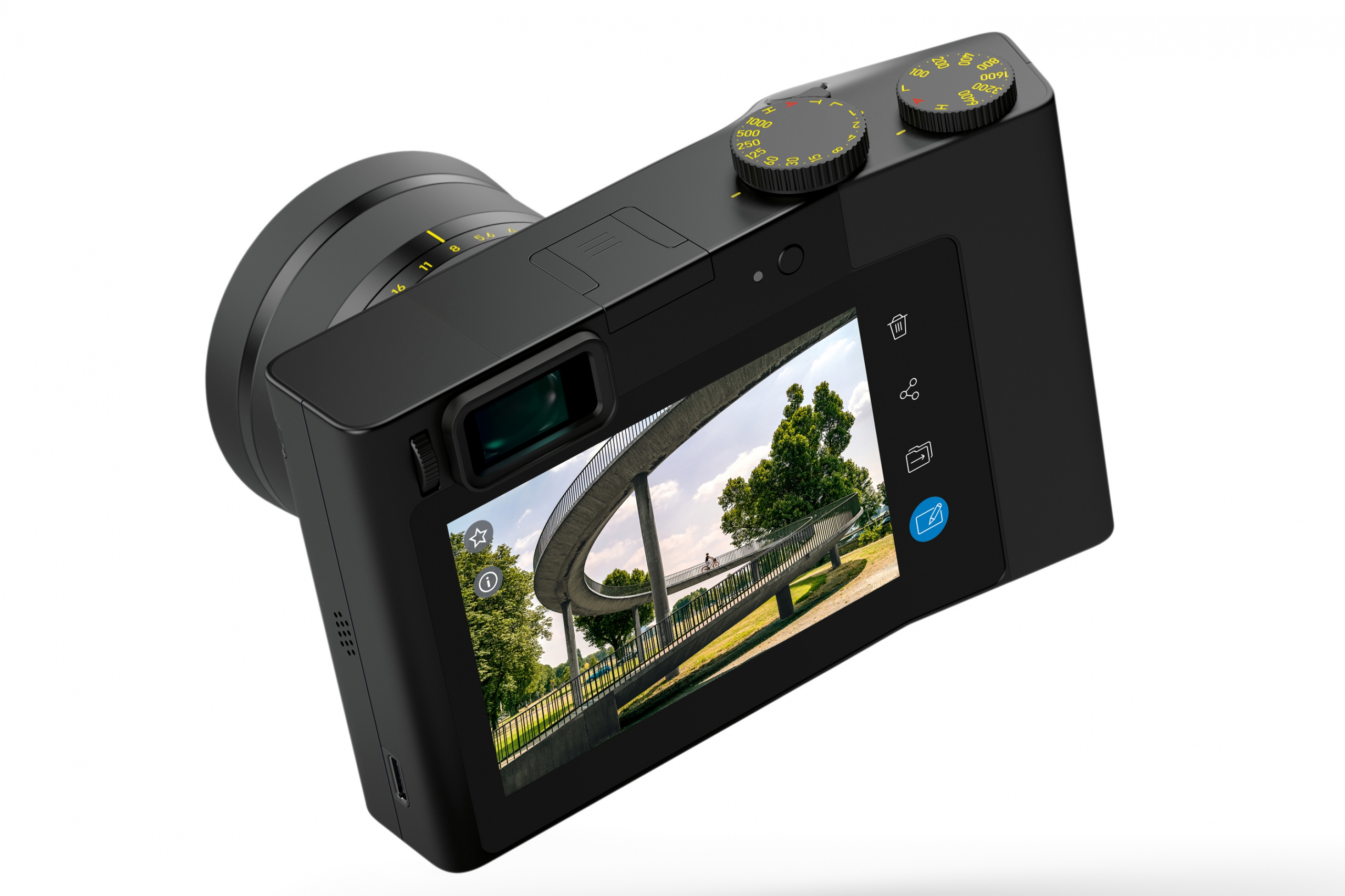 Esta cámara full frame de 37.4 megapíxeles, viene con un lente fijo de 35mm f/2 y pantalla táctil sin ningún tipo de inclinación. Pero lo que llama poderosamente la atención, es que viene con Lightroom integrado. Sí, el editor profesional de fotografías más potente y popular del mercado. Además, directamente desde la cámara puedes subir la fotografía editada a Dropbox, otras redes sociales e incluso enviarla por correo. ¿Les parece esto familiar?